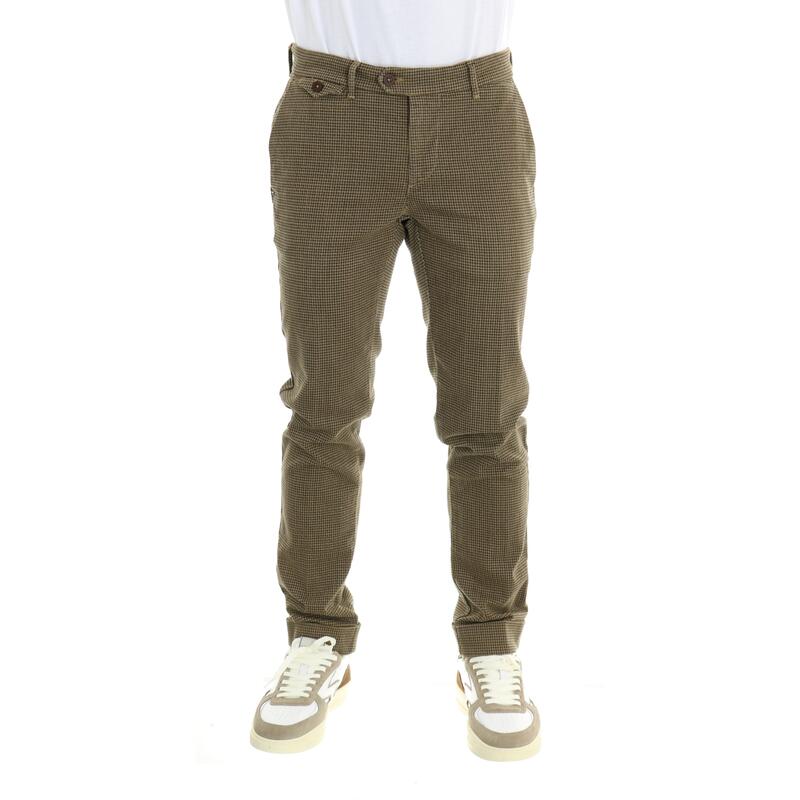 Pantalone stretch in microfantasia quadretti, vita media, tasca america, chiusura con bottone e zip, orlo con rovescia. Vestibilità slim.