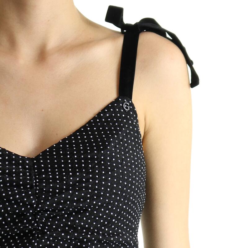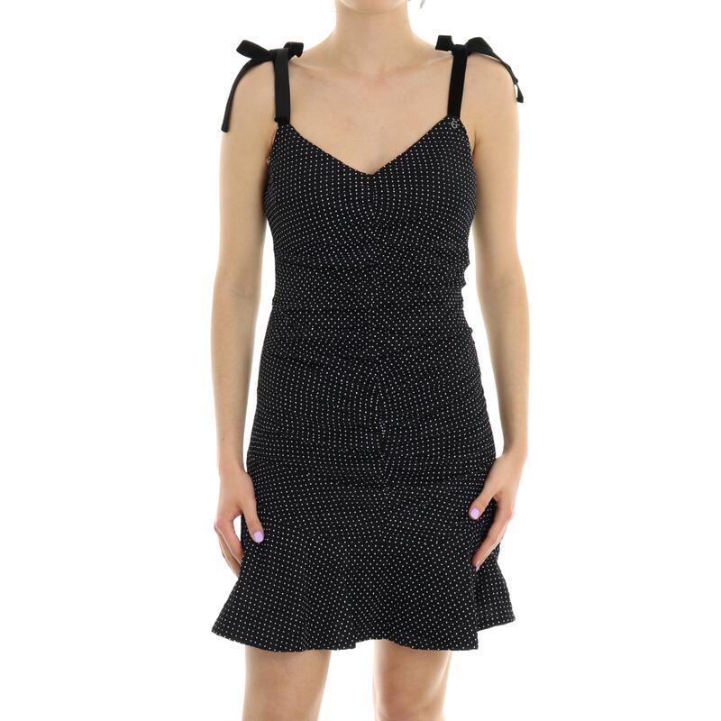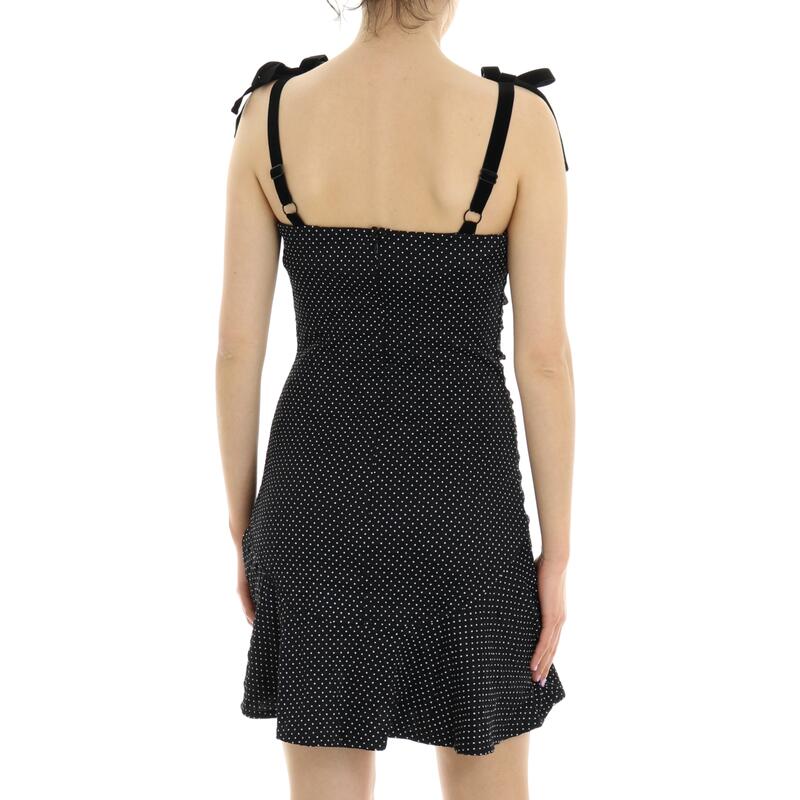 Abito corto in fantasia a pois, spallini in velluto regolabili con chiusura a fiocco, balza in fondo, chiusura con zip dietro. Vestibilità slim.